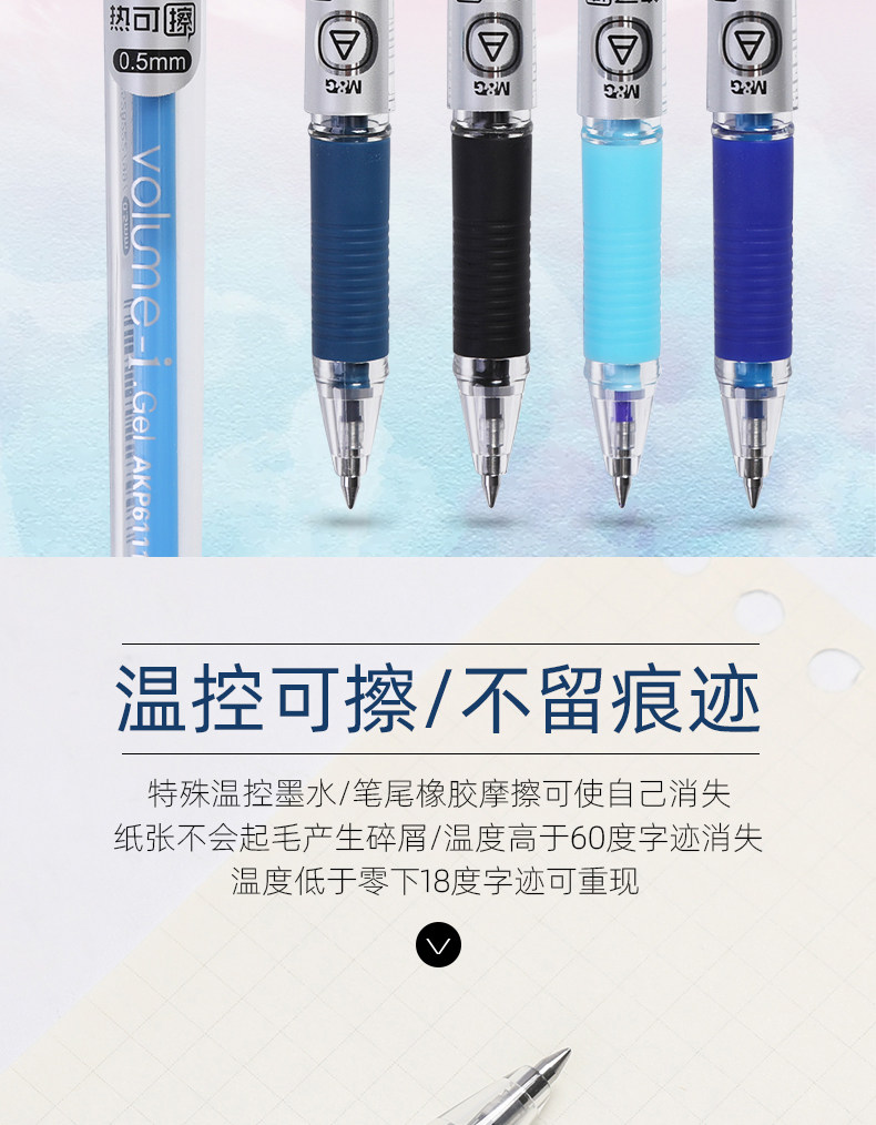 一般情 2113 况下不会褪 色。 但是温度超 5261 过60 度时 ,字迹会消失。 4102 可擦 笔的介绍 它采用特殊的 1653 高分 子材 料作为油墨基料,经特殊工艺装配而成。 在书写过程中,油墨通过笔尖在纸张上形成一层可擦颜料膜,即可擦墨迹,该字迹在数小时内像铅笔一样可用普通橡皮擦擦掉,留存的字迹. 原价:11.2元 7.32折 距离结束: 去天猫抢购>> 收藏. 可擦笔采用特殊的 5261 高 分子 材料作为油 墨基 料 4102 ,较普通中 1653 性笔的油墨分子要大些,这样碳素比较难以被纸张吸附或渗入。 书写过程中,这种油墨在纸张上形成一层可擦颜料膜,因而字迹可用普通橡皮擦擦掉。 可擦笔有好处也有坏处。可擦笔的好处:.